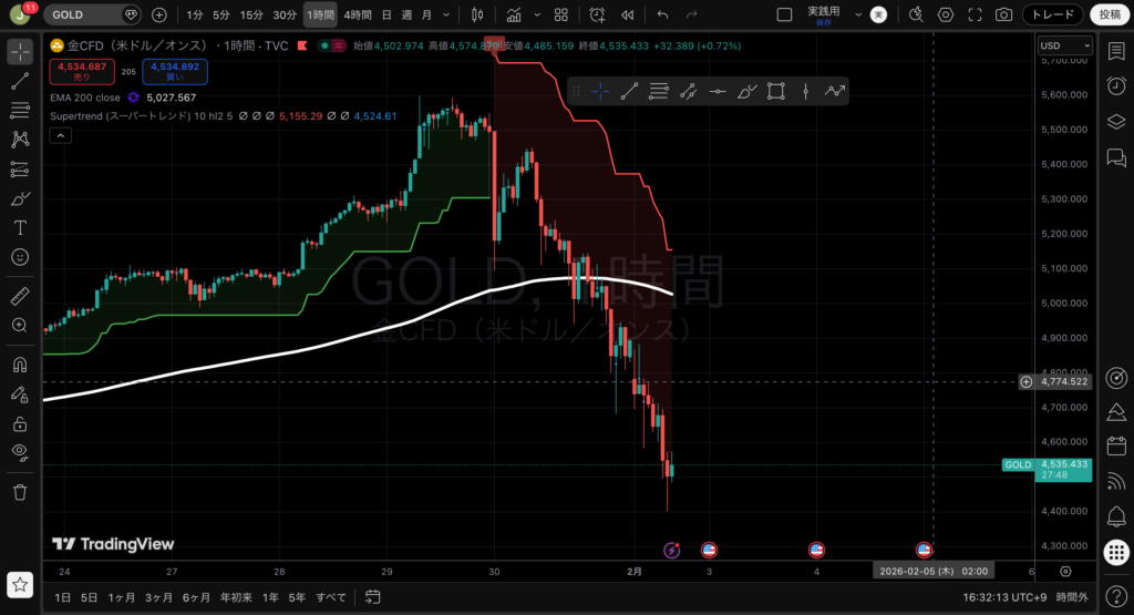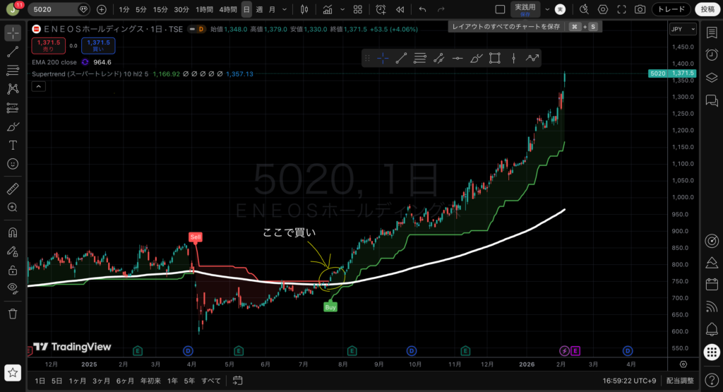 • Supertrendが買いシグナルに転換 という、典型的な上昇トレンド入りの形が出ていました。