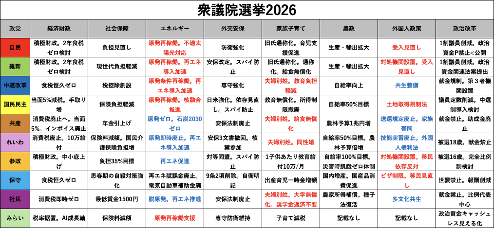 【衆議院選挙2026】各政党の政策早見表 from 日経新聞