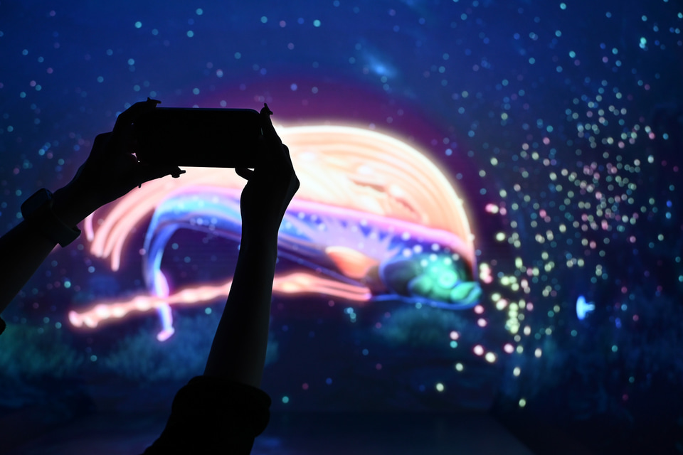 専用アプリ「ワンダリアアプリ」を使うと、映像に登場する生き物にスマートフォンをかざすだけで情報が表示されます。コレクション要素もあり、ただ鑑賞するだけでなく、探検するように楽しめるのが特徴です。