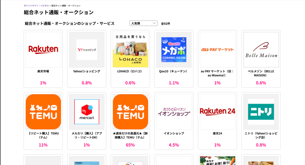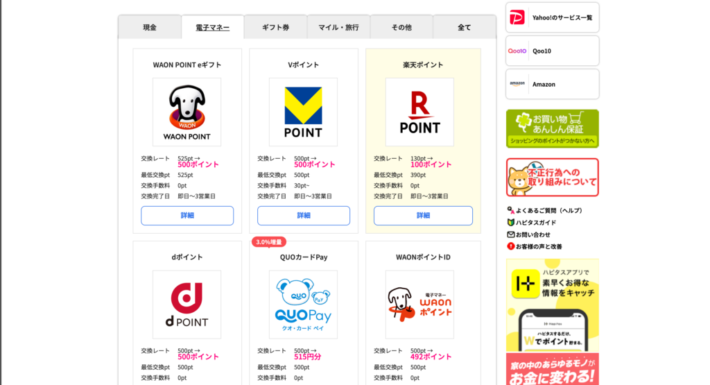 ハピタスは運営歴が長く、利用者も多いサービスです。 ポイント交換先も大手が揃っているため、初めてでも安心して使えます。