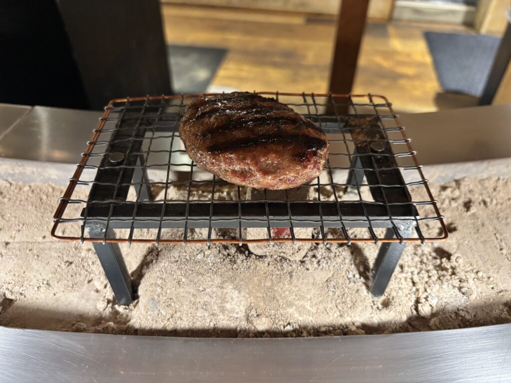 炭火で焼かれたハンバーグは、中心にほんのり赤みが残る絶妙な火入れです。 肉の旨味がしっかり閉じ込められていて、噛むたびに肉汁が広がるジューシーさがあります。